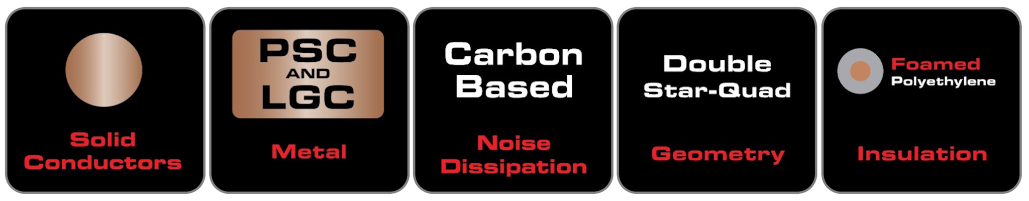Carbon-Based Noise Dissipation a Cross-Talk-Dissipation (systémy pohlcení šumu a přeslechů): Potažení negativních vodičů speciální vrstvou částečně vodivého polyethylenu s obsahem uhlíku. Tento výjimečný materiál tlumí ruchy, které tak nejsou přenášeny zpět do zesilovače. Kladné vodiče jsou pak izolovány pomocí polyethylenové pěny se vstříknutým dusíkem, protože je nízko-ztrátová a příznivá co se rušení a zkreslení signálu týká.