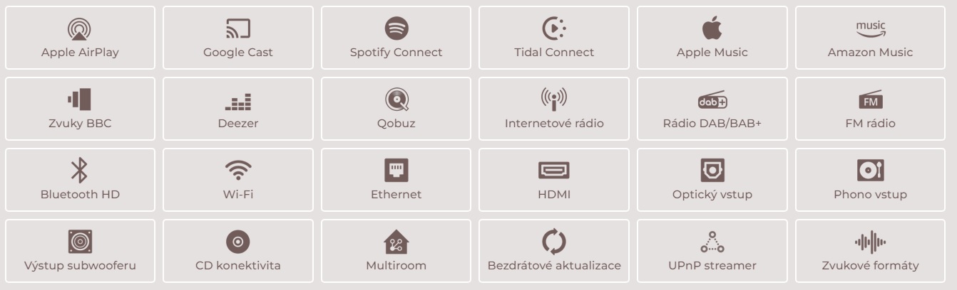 - Podporované hudební služby: Amazon Music, BBC Sounds, Deezer, Qobuz a další